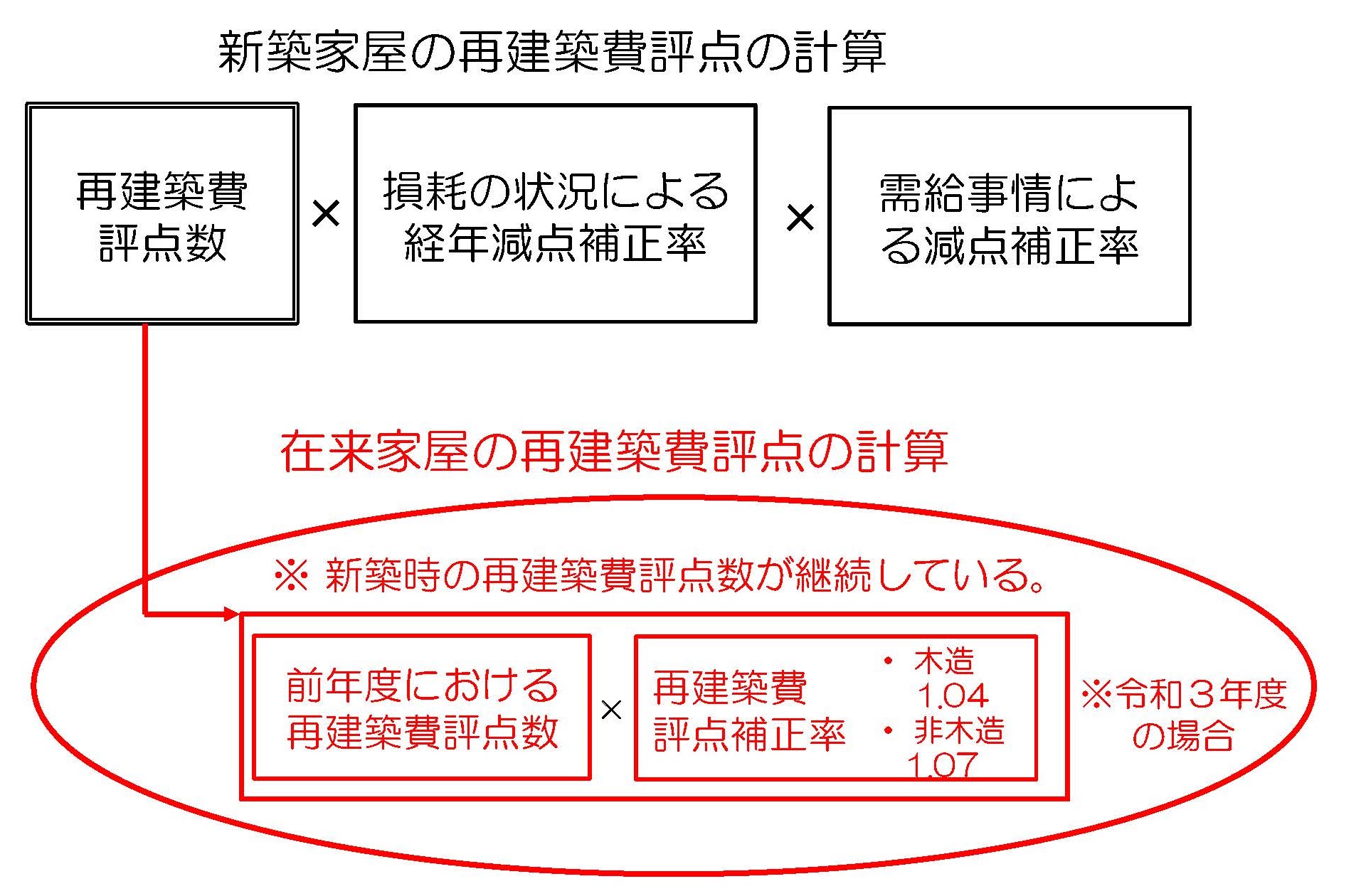 在来家屋の計算方法は、前基準年度再建築費評点に築年数の経過年数に応じた経年減点補正率を乗じて求めますが、「再建築費評点補正率」も考慮されます。