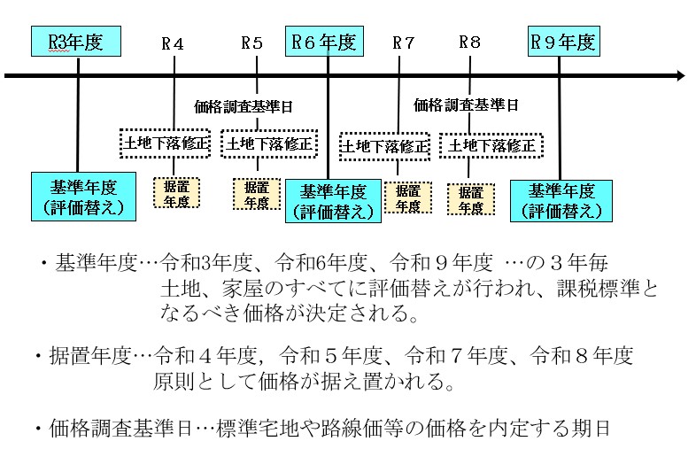 この年度を基準年度(又は評価替え年度)と言いますが、これは昭和33年から継続している制度で、最近の基準年度は令和6年度ですが、次は令和9年度になります(令和6年時点)。