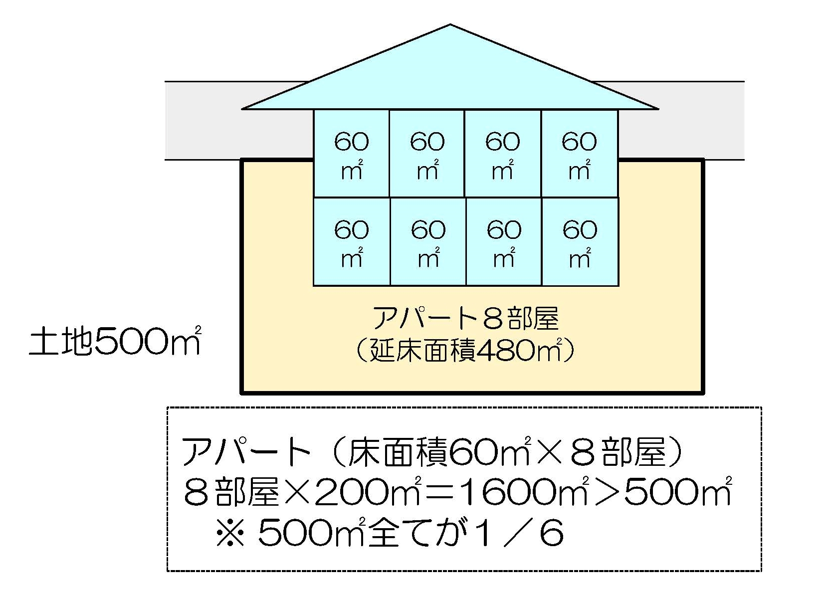 例えば、500㎡の土地に8戸(60㎡/戸)の2階建てアパートがあるとします。この場合は、1戸ごとに200㎡相当が1/6になりますので、8戸×200㎡=1,600㎡までが1/6になり、この例の500㎡すべてが1/6になります。