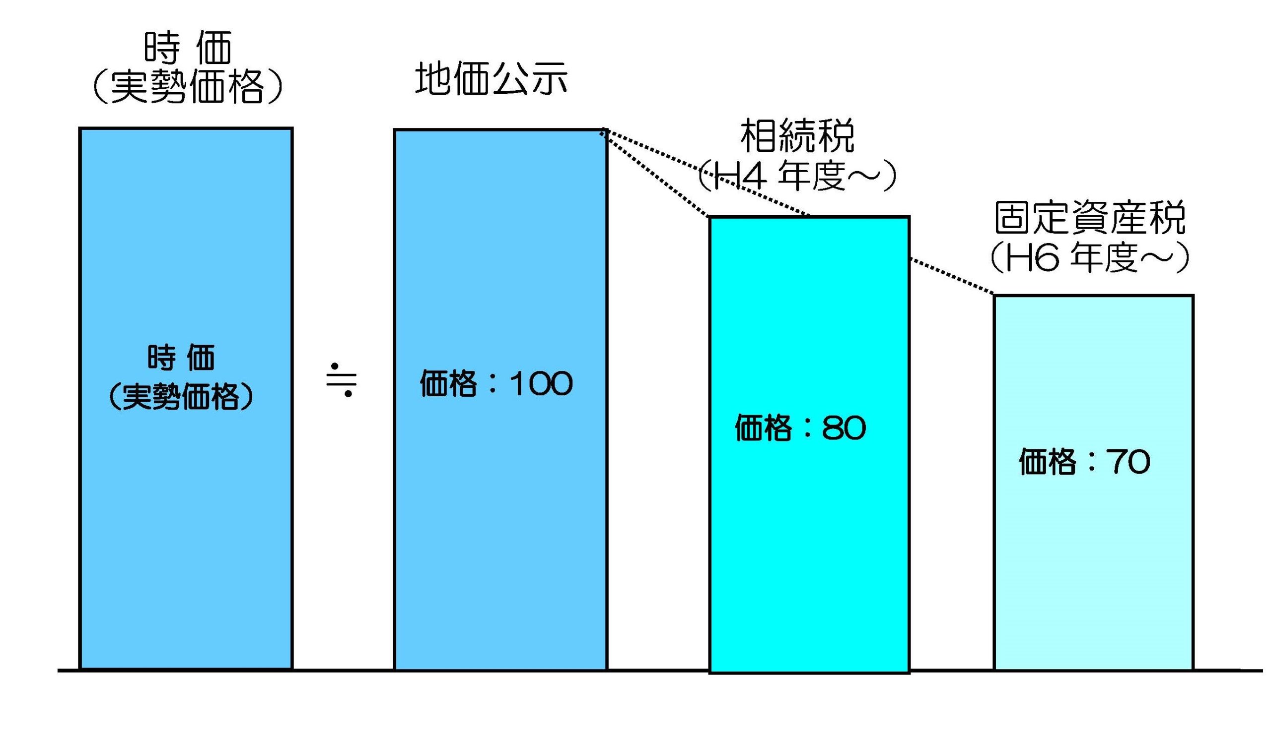 昭和の初期頃には、固定資産評価額は時価の7割程度でしたが、昭和末期のバブル最盛期には15%程度へと低下していました。