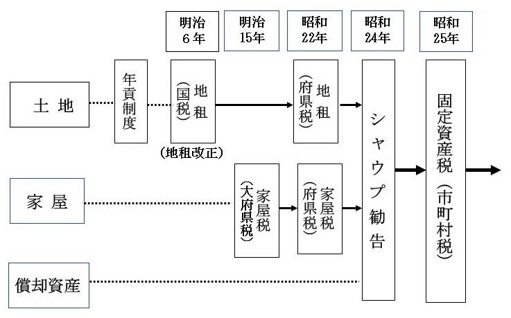 そして、土地と同じく、昭和24年の「シャウプ勧告」により、昭和25年に市町村税の固定資産税となりました。