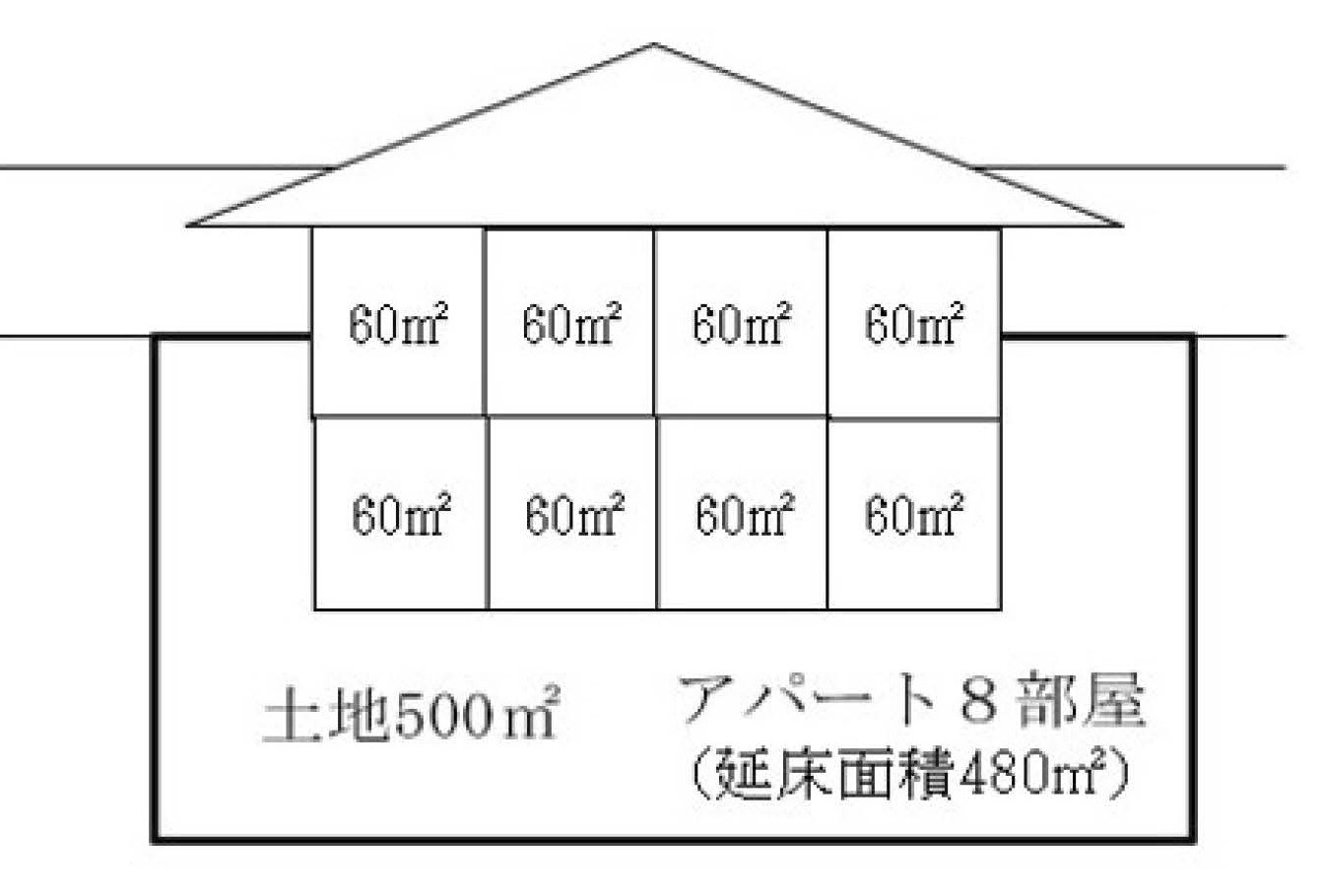 例えば、500㎡の土地に8戸(60㎡/戸)の2階建てアパートがあるとします。この場合は、1戸ごとに200㎡相当が1/6になりますので、8戸×200㎡=1,600㎡までが1/6になり、土地500㎡すべてが1/6になります。