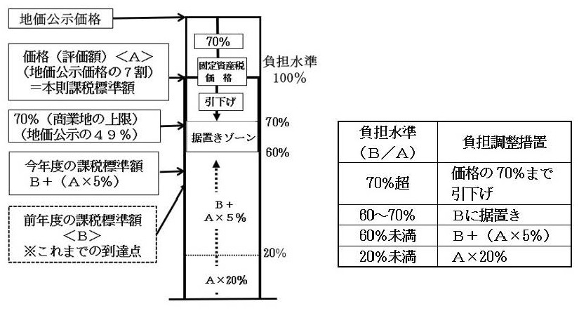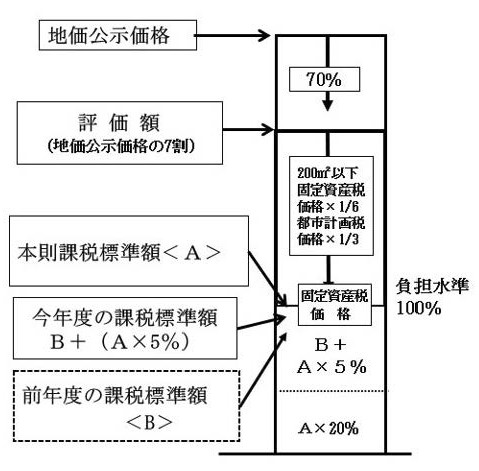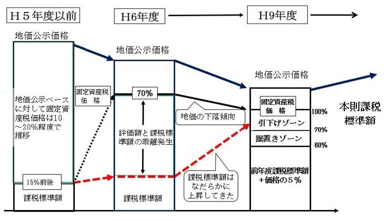 平成6年度に地価公示価格の7割を固定資産税の価格とすることにしたものの、それまでは実質的に10%〜20%程度であったものを一気に上げることが出来ないことから、少しずつ上げていくという経過的措置(負担調整措置)が採用されました。