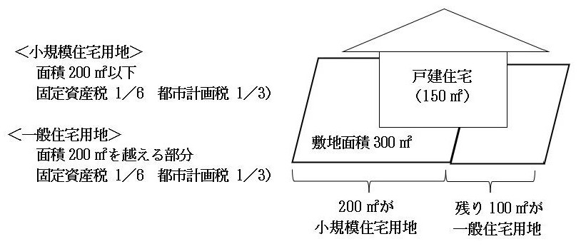 例えば、300㎡の土地に居住用の家屋(戸建住宅)が建っている場合は、200㎡までが小規模住宅用地の1/6、残りの100㎡が一般住宅用地の1/3となります。