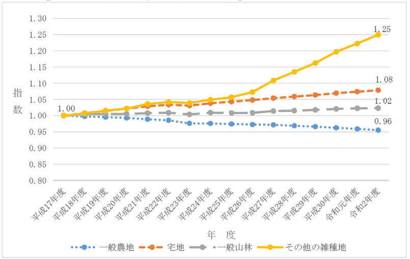 下図「地目別の評価総地積(指数)の推移」によると、令和2年度における「その他の雑種地」の評価地積は約4,248K㎡であり、平成17年度と比較して約1.25倍となっています。
