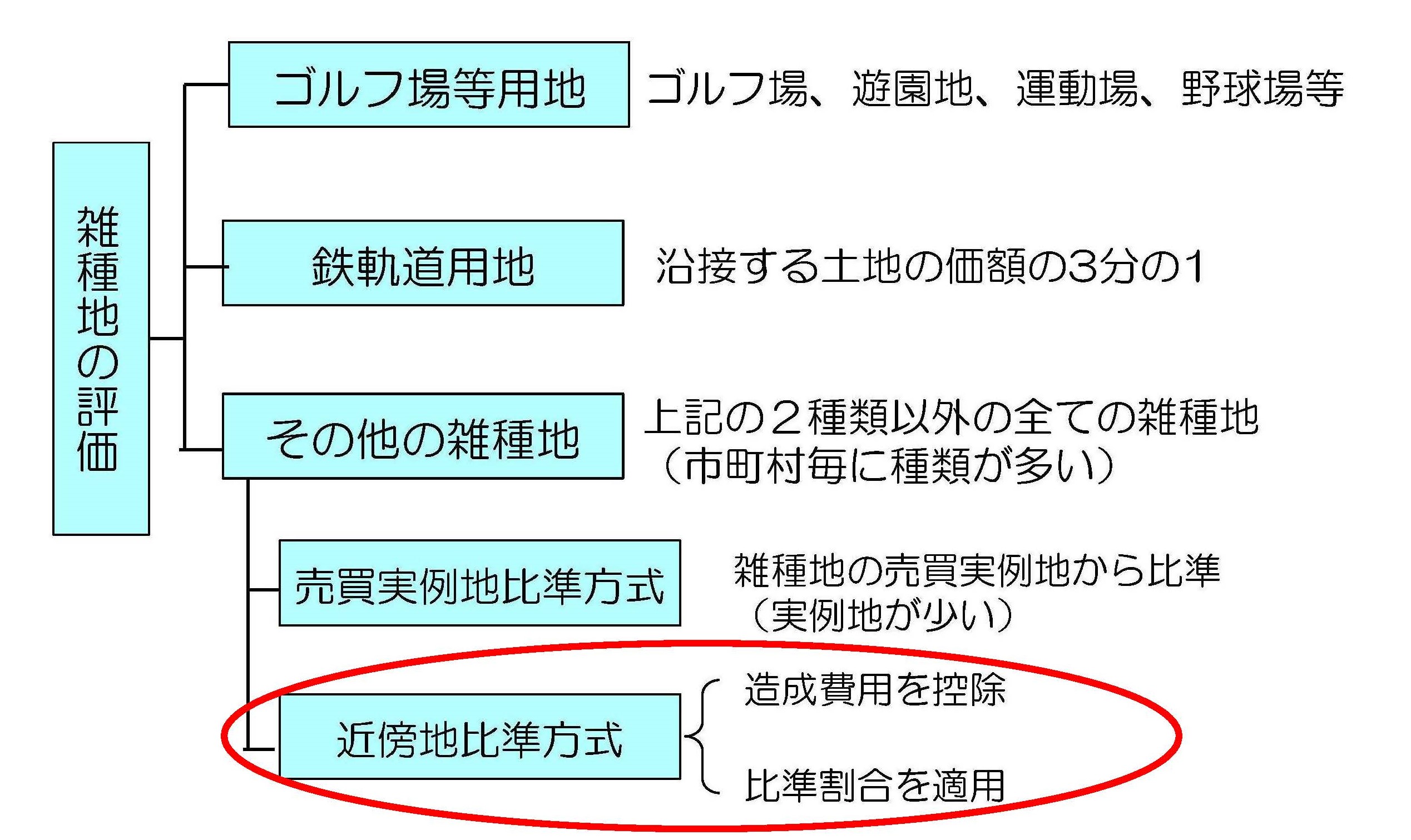雑種地の評価は、二及び三に掲げる土地を除き、雑種地の売買実例価額から評定する適正な時価によつてその価額を求める方法によるものとする。ただし、市町村内に売買実例価額がない場合においては、土地の位置、利用状況等を考慮し、附近の土地の価額に比準してその価額を求める方法によるものとする。