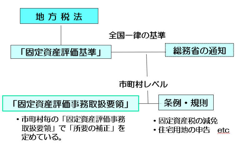 そして地方税法と固定資産評価基準の下に市町村ごとに、評価関係では「固定資産評価事務取扱要領」が定められ、課税関係では「条例・規則」(市町村議会で決定)が定められ、「所要の補正」として評価・課税が行われています。