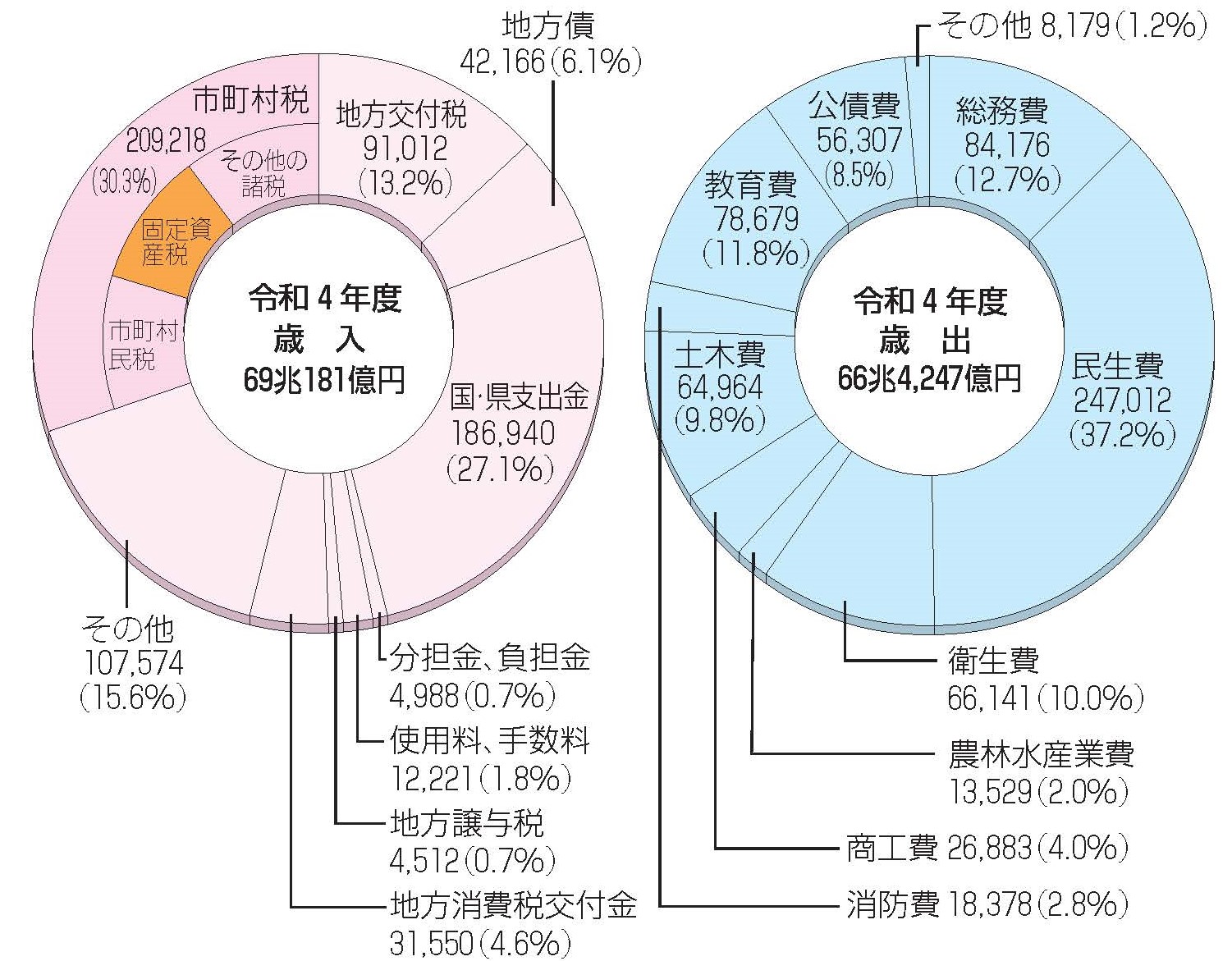 市町村のお金の収支は財政状況として表されますが、収入を歳入、支出を歳出と呼びます。