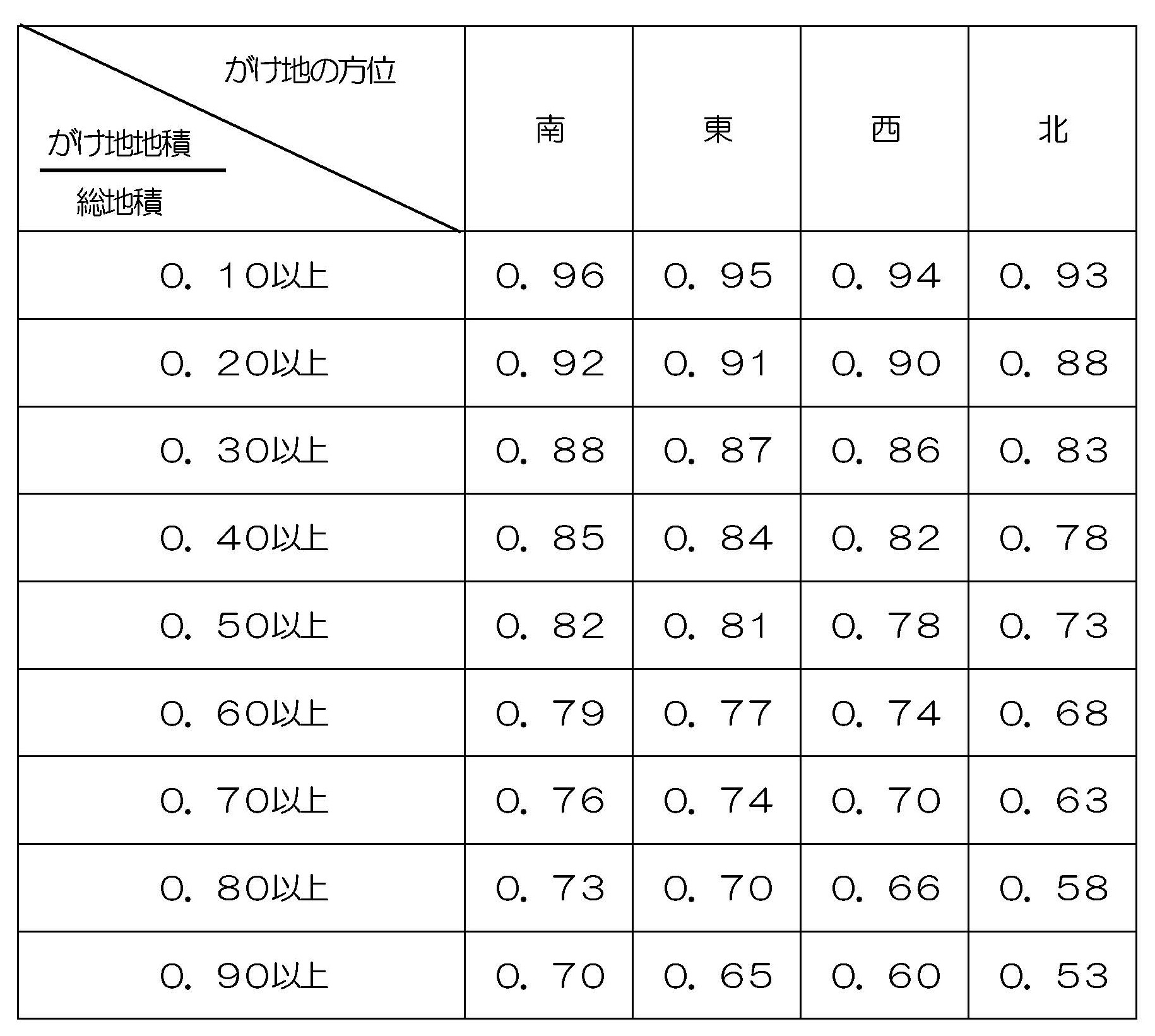 評価方法は基本的に相続税評価と同じですが、固定資産税の場合は、がけ地補正率表に方位区分が無いところが違います。