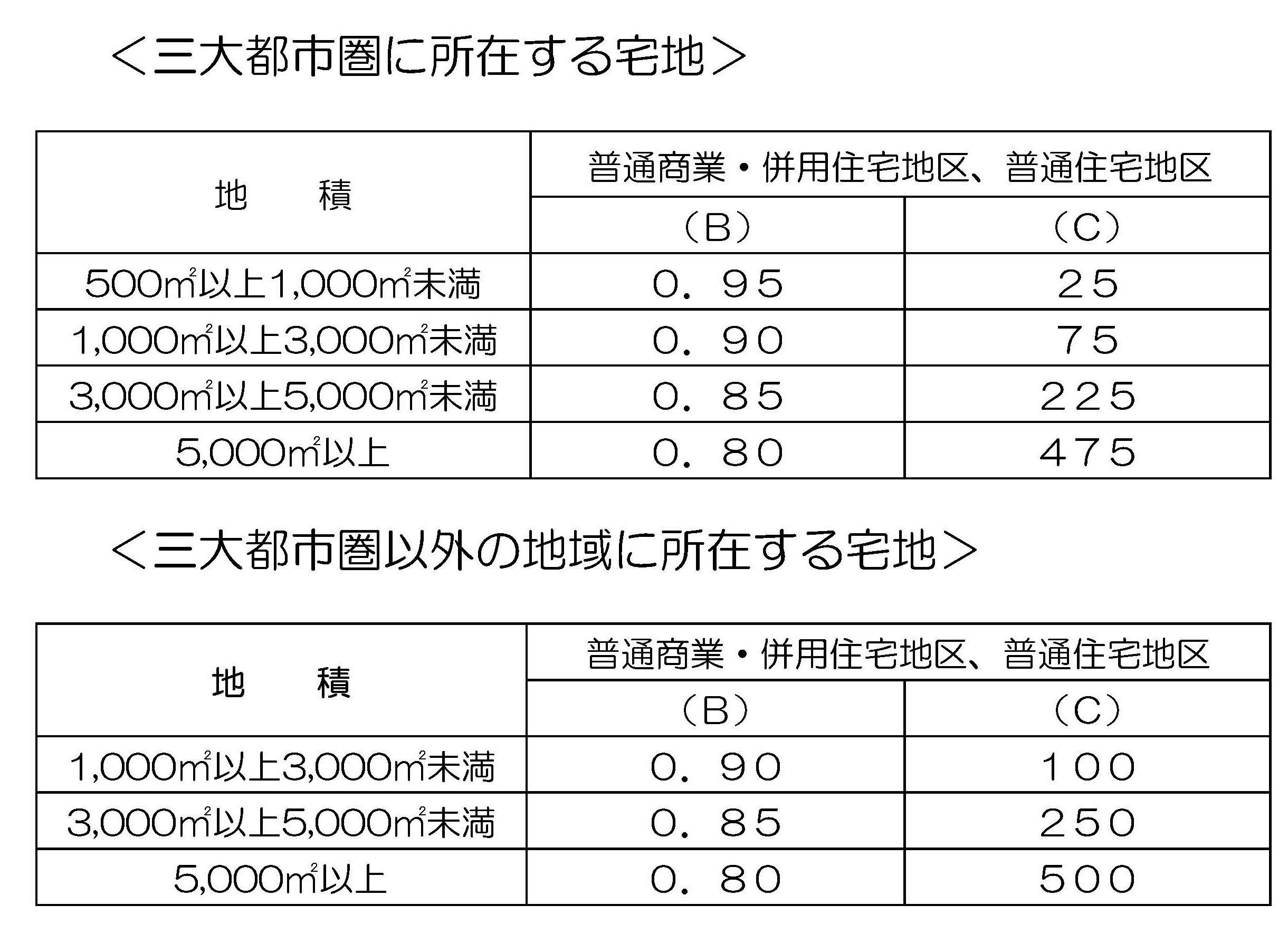 なお、上記「規模格差補正率」中の(B)及び(C)は、地積規模の大きな宅地の所在する地域に応じて、それぞれ次に掲げる表のとおりです。