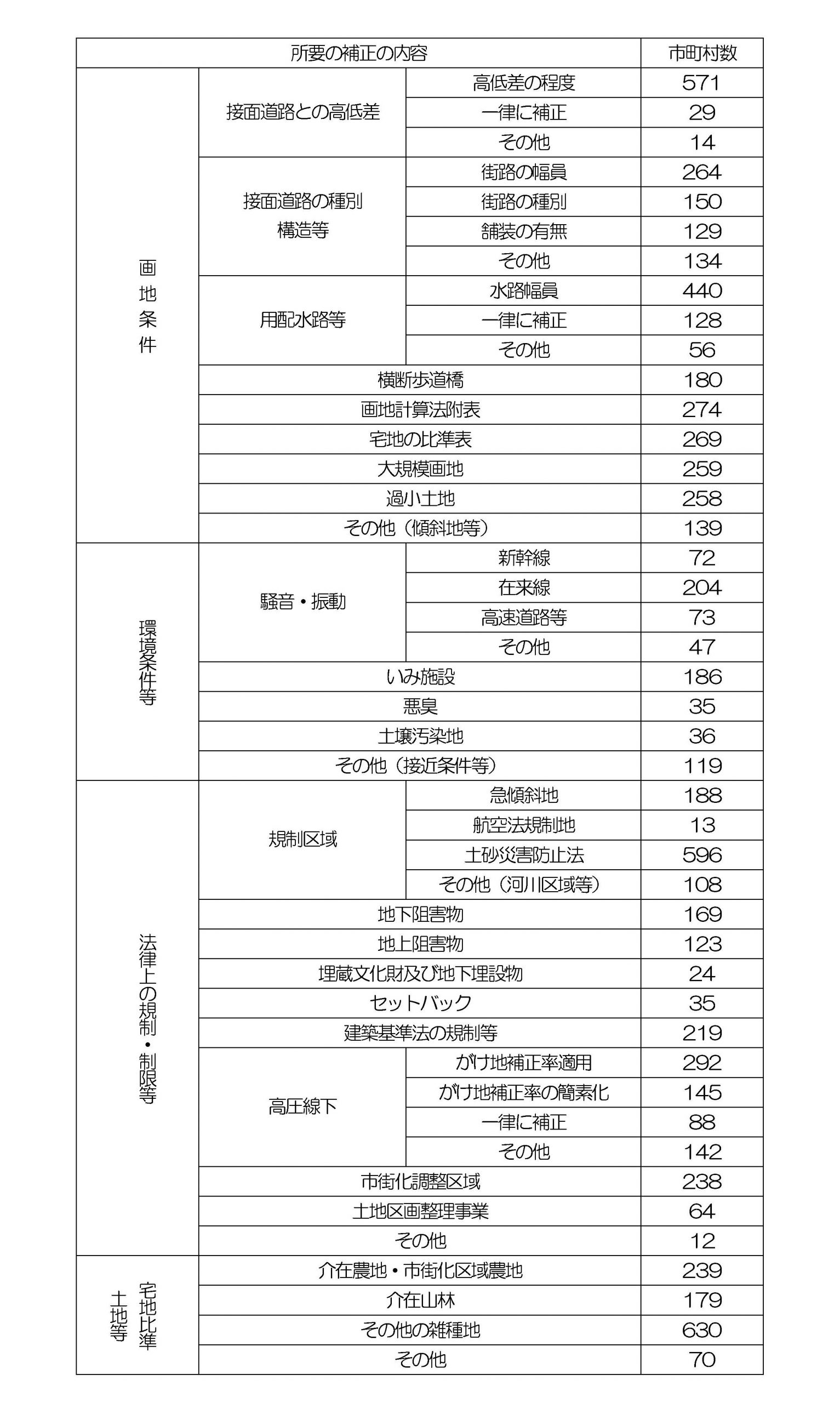 次の表は、全国の市町村での「所要の補正」による画地補正の実施例です(平成25年版)。