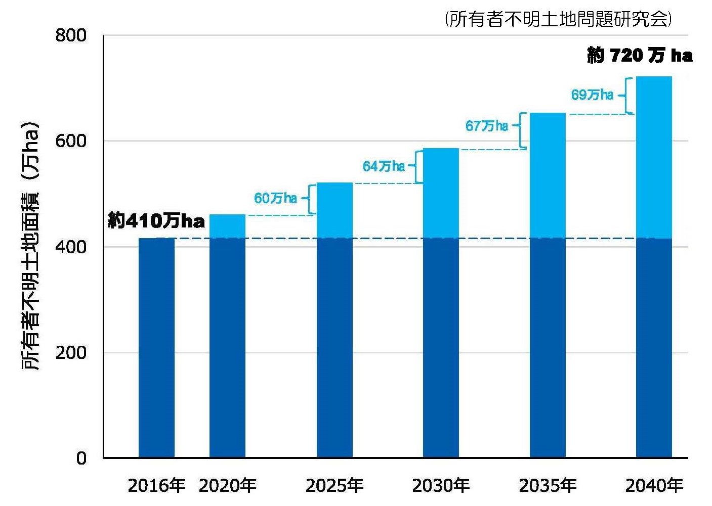 一般財団法人「国土計画協会」の所有者不明土地問題研究会による試算結果によると、日本全国の所有者不明土地は、現在推計で410万ヘクタール(所有者不明率20.3%)で、九州の土地面積(約368万ヘクタール)を越える面積となり、2040年までには720万ヘクタールに膨らむ見通しです。北海道本島の土地面積(約780万ヘクタール)に匹敵する面積になります。