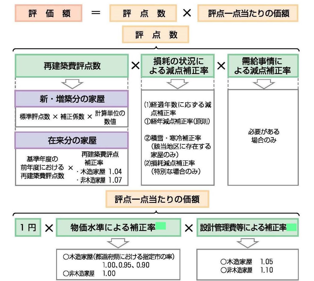 在来分評価方法は中古家屋の評価方法となっており、既に算出されている前評価基準による再建築費表点数に対し、資材費等の価格の変動割合を基礎として定められた再建築費評点補正率を乗じることにより、基準年度の再建築費表点数を求める方法です。