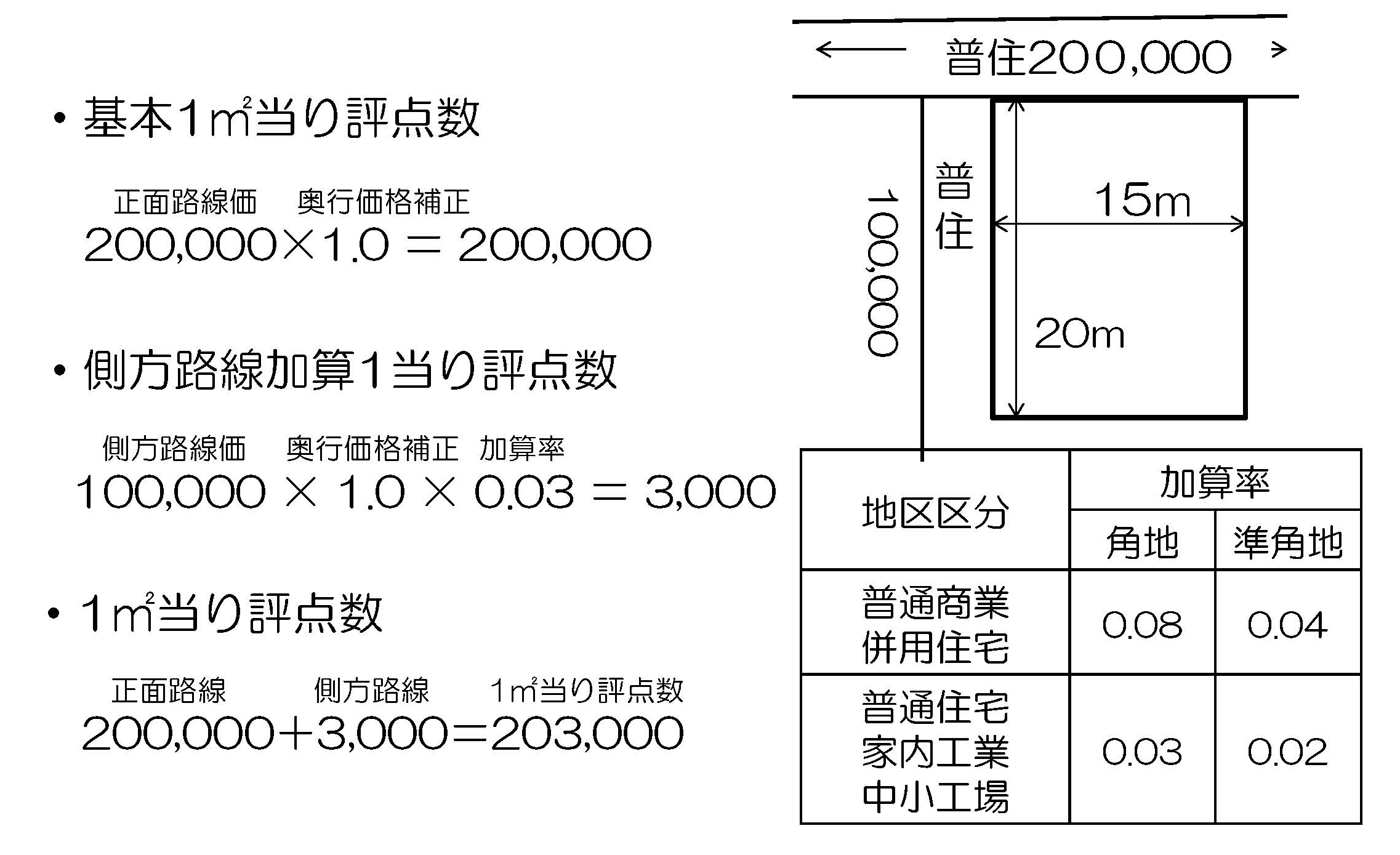 評価は、正面路線価に側方路線価の加算率を乗じた評点数を加算して、画地1平米当りの評点数を求めます。