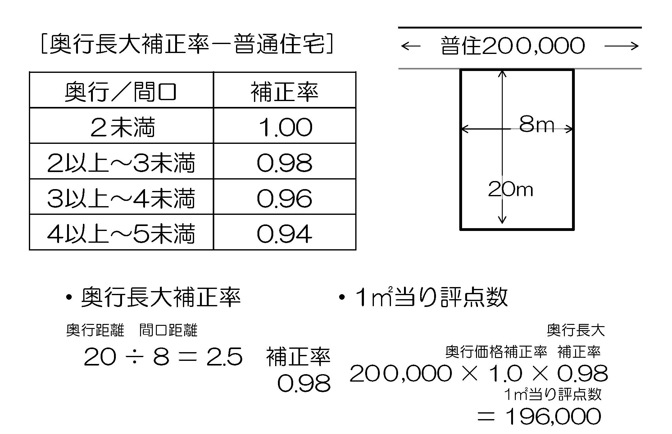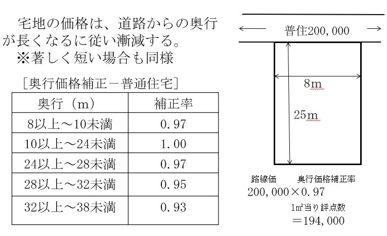 宅地の価格は、道路からの奥行が長くなるに従って漸減します。また、著しく奥行が短い場合も同様です。