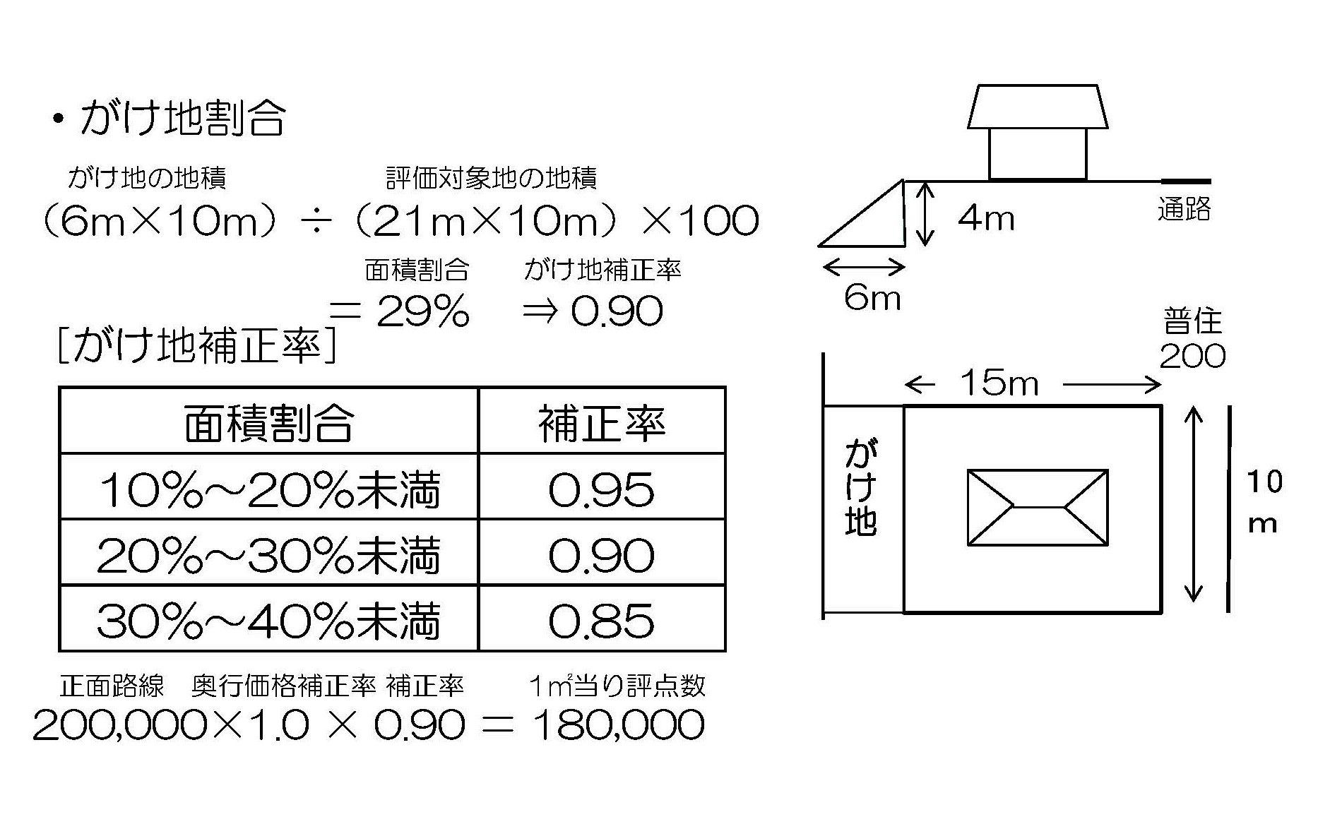 土地の一部か又は全部ががけ地等で通常の用途に供することができない土地については、土地の総面積に対するがけ地部分の面積割合に応じた補正率により求めます。