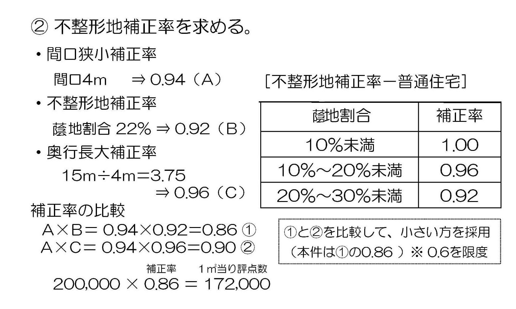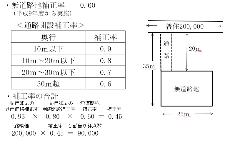 評価は、無道路地補正率0.6と通路開設補正率を乗じて求めます。