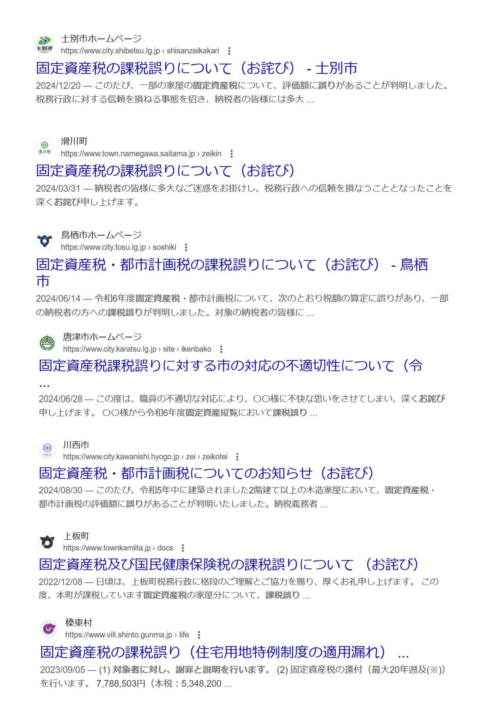 例えばWEBサイトの検索画面で、『固定資産税・課税誤り・お詫び』とのキーワードを入力して検索しますと、次のような市町村による「評価誤りへの『お詫びサイト』」が検索されます。