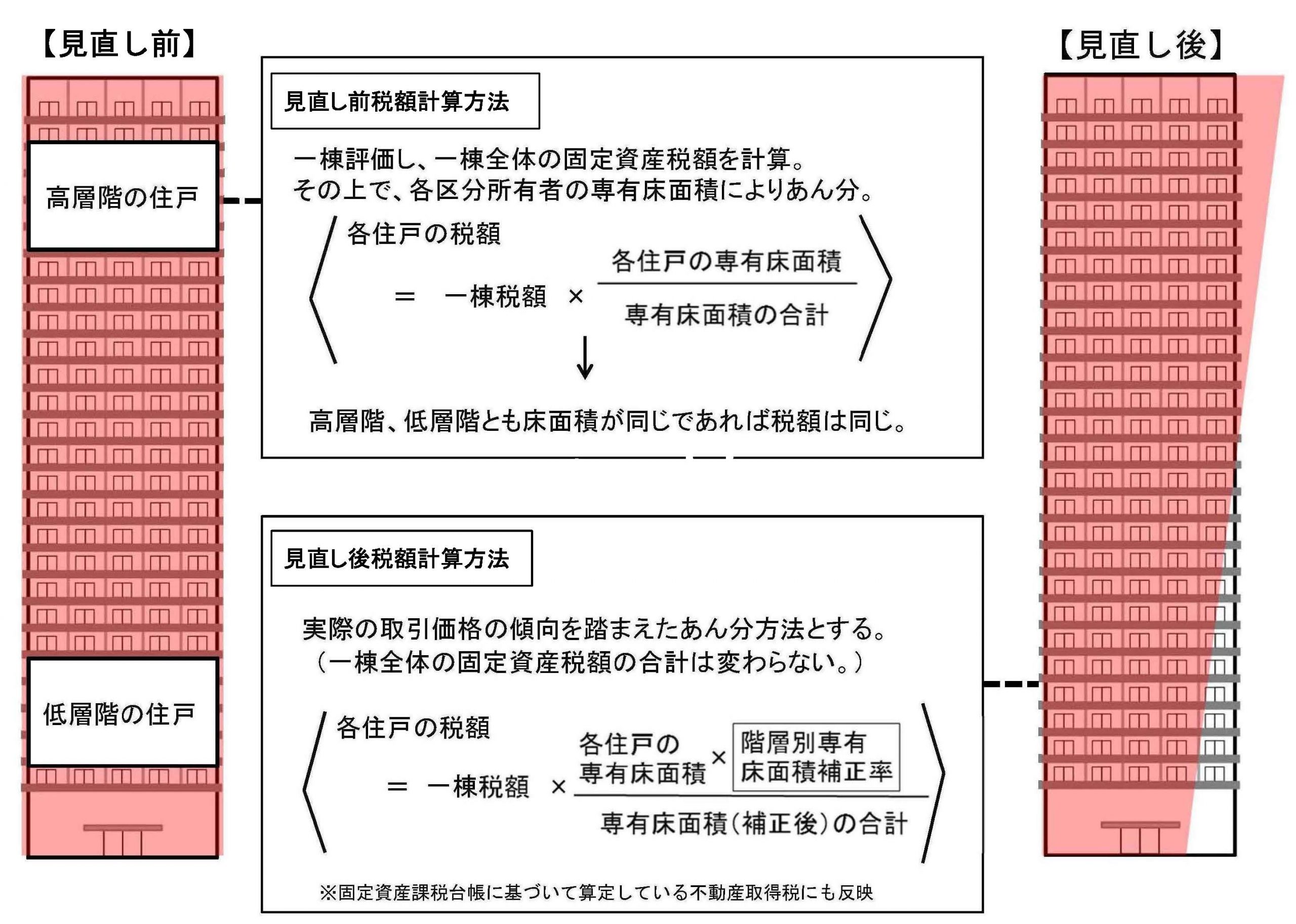 そこで、タワーマンションに係る家屋の固定資産税額についての不公平感を解消することを目的として、専有部分の床面積を階層の差異による床面積当りの取引単価を反映する見直しとなりました。