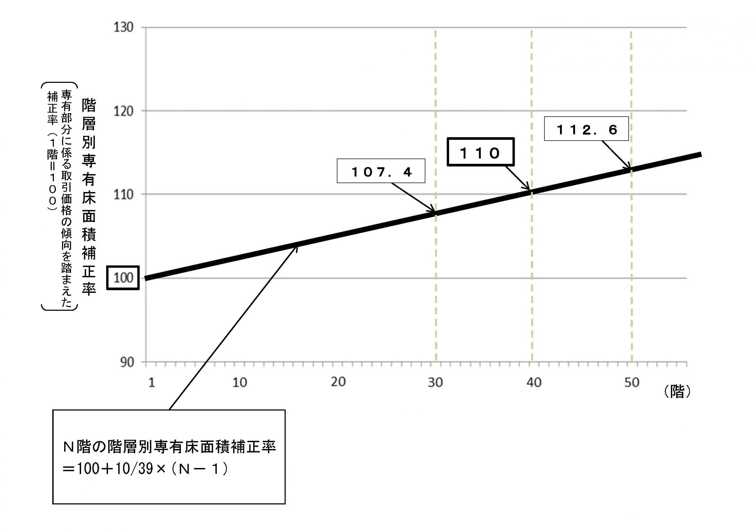 階層別専有床面積補正率は、最近の取引価格の傾向を踏まえ、タワーマンションの1階を100とし、階が1つ増えるごとに、これに10/39を加算した数値とされます。したがって、[N階の階層別専有床面積補正率=100+10/39×(N-1)]となります。
