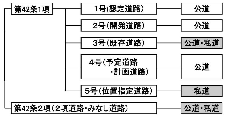 建築基準法では42条1項と2項に道路の種類が定義されていますが、建築基準法の道路は必ずしも公道とは限らず私道も含まれています。