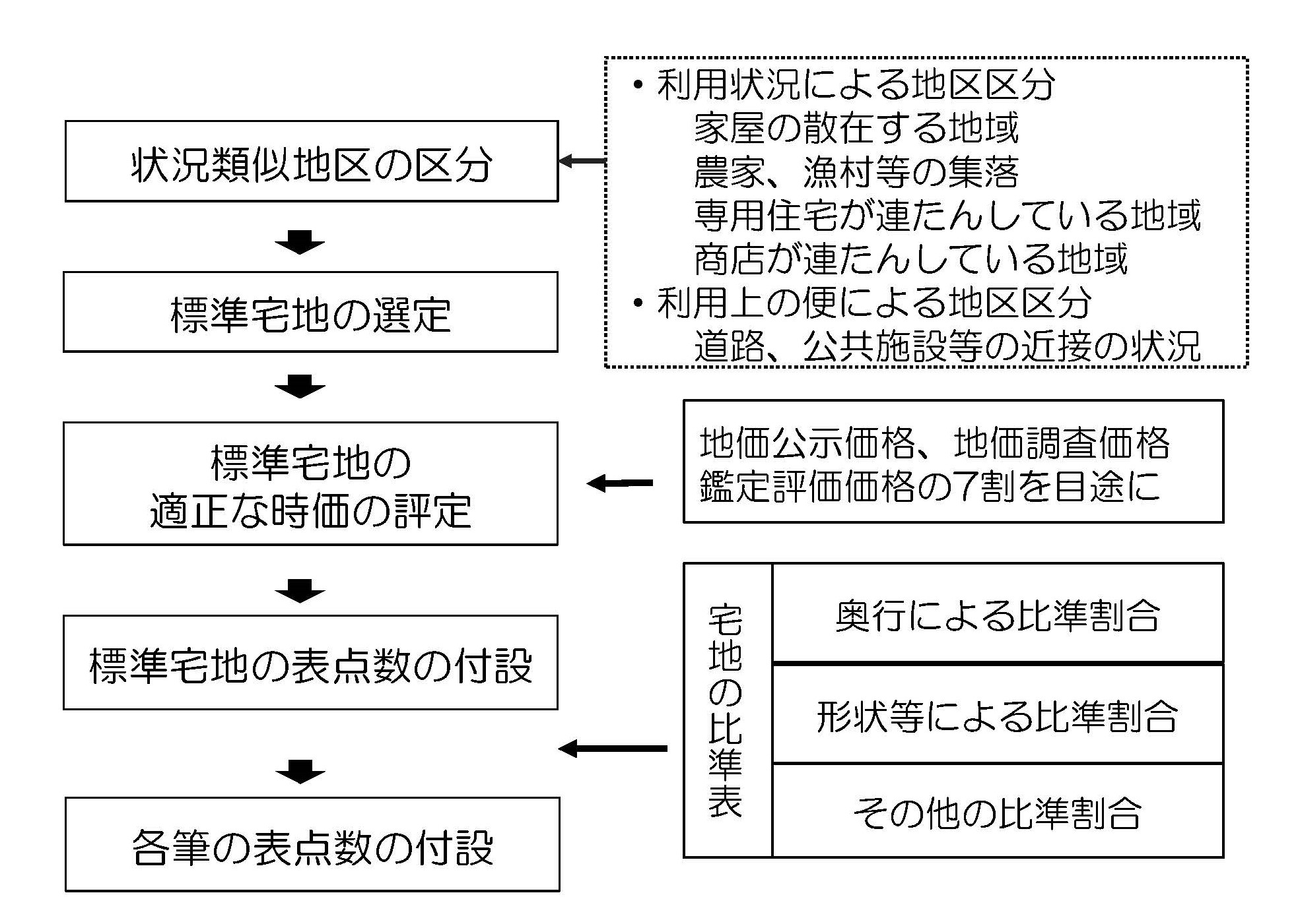 まず状況類似地区ごとに標準宅地を選定し、この標準宅地の適正な時価から求めた評点数に比準して、状況類似地区内の各筆の宅地の評点数を付設します。