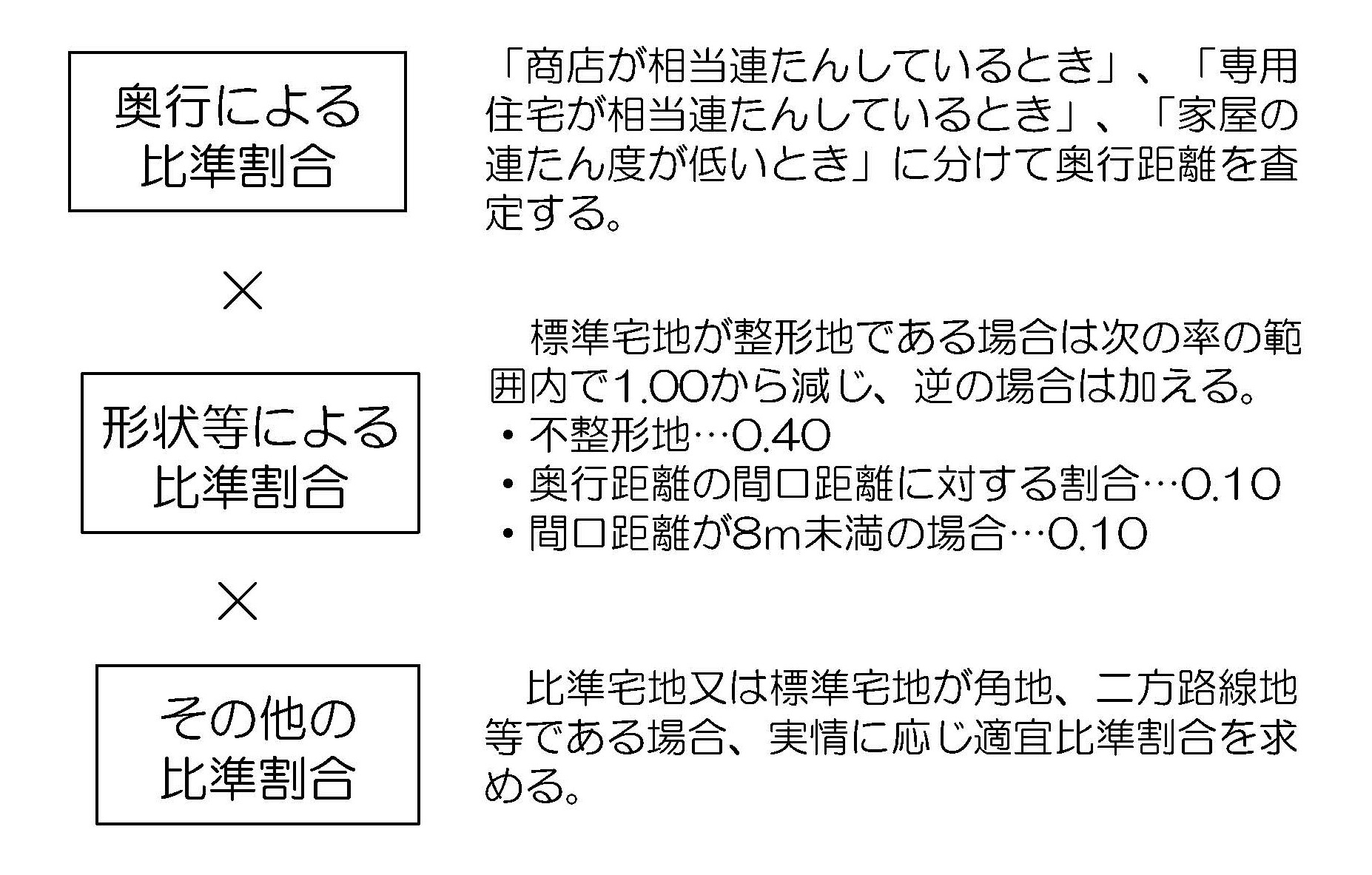 固定資産評価基準では、比準割合の項目として、「奥行による比準割合」、「形状等による比準割合」、「その他の比準割合」の3つの類型の相乗積により求めることとされています。