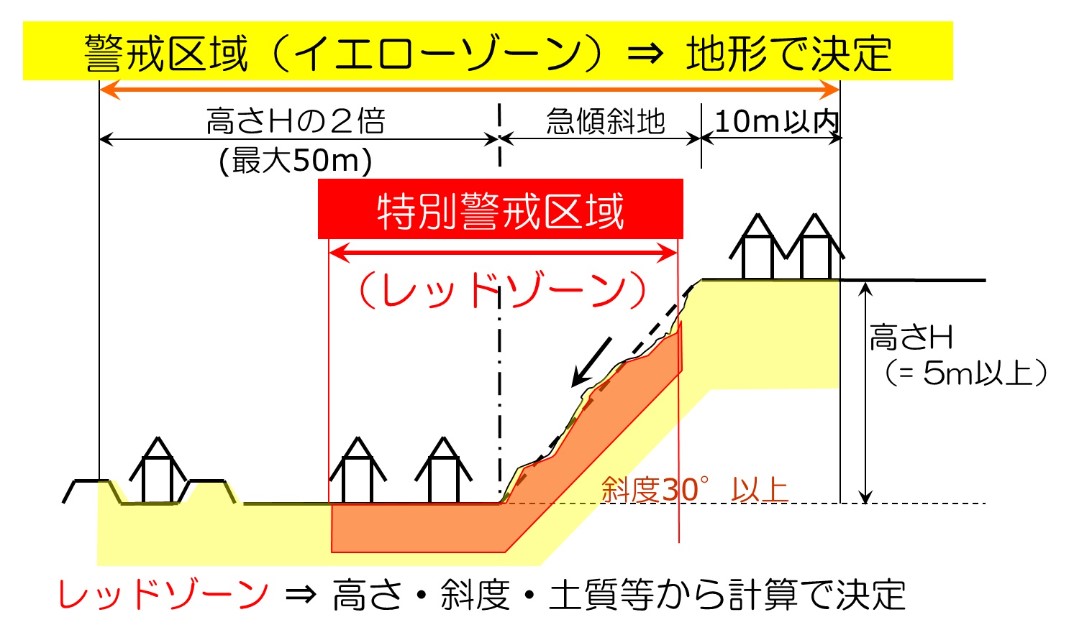 この中で、土砂災害警戒区域(イエローゾーン)と土砂災害特別警戒区域(レッドゾーン)とに分かれます。