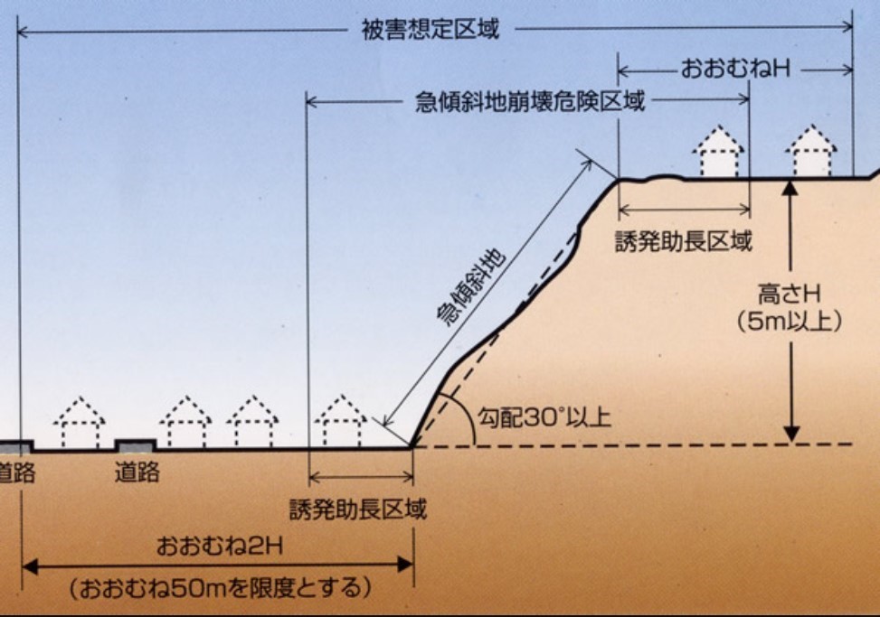 急傾斜地の崩壊等が発生した場合に、建築物に損壊が生じ住民等の生命又は身体に著しい危害が生ずるおそれがあると求められる区域で、特定の開発行為に対する許可制、建築物の構造規制等が行われます。